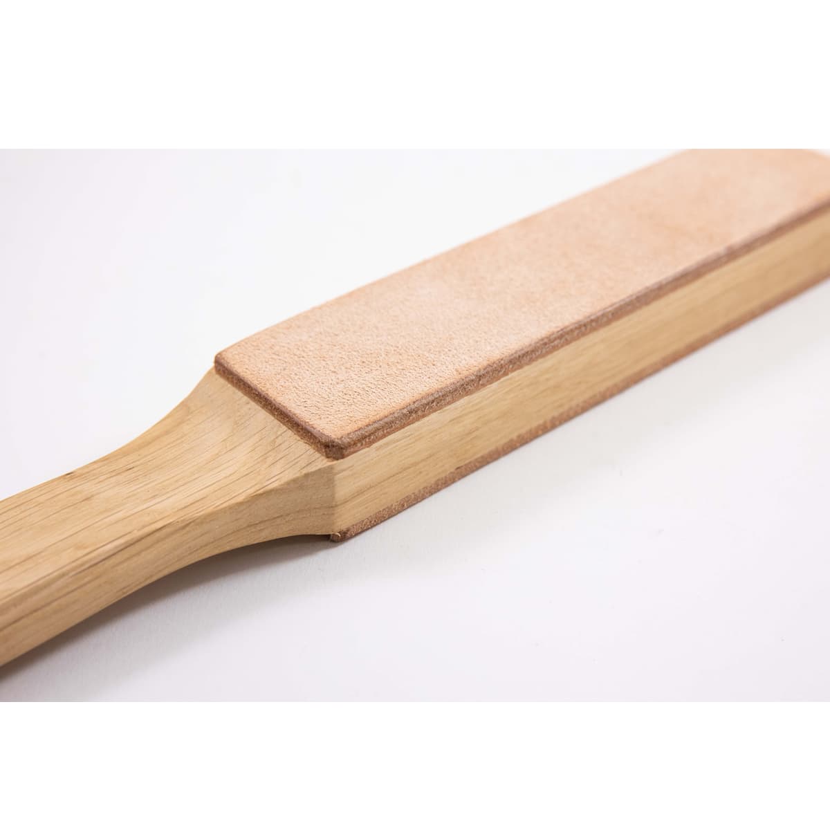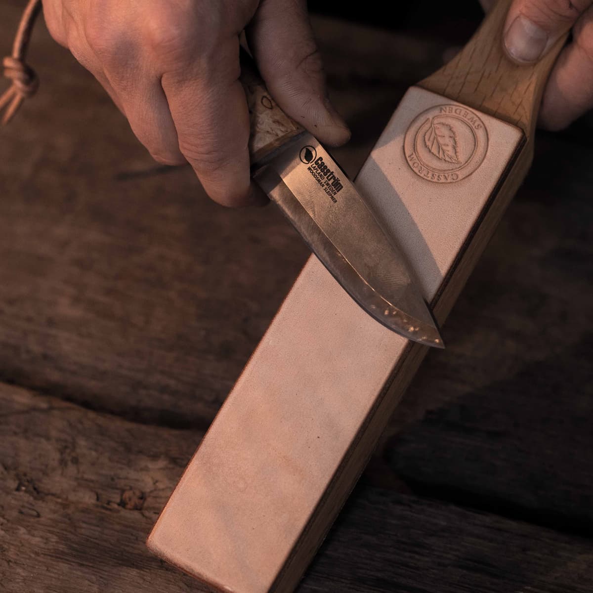 Casström's Paddle Strop is an artisan made, double sided veg tanned leather strop best used at home or at basecamp, that when paired with Casström's sharpening compounds, provides the means to refine a sharpened edge to a razor finish. Made with 3.5mm thick leather, with a hide side (smooth), a flesh side (coarse) and a core of waxed oak, this 18 cm x 4.5 cm sized strop is an excellent addition to anyone's sharpening tools.