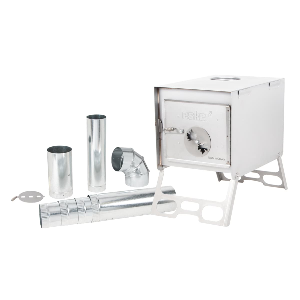 Esker's Baffin hot tent stove is made from Canadian carbon steel, is 100% manufactured in Canada, and is designed for operation in Canadian winters. Made for use in smaller to mid-sized tents (9x9, 10x10, 10x12), the Baffin provides a large enough burn chamber to keep tents warm and comfortable in the dead of a Canadian winter, whilst still being light and portable enough for easy transport and set up. Available in 2 pipe configurations.