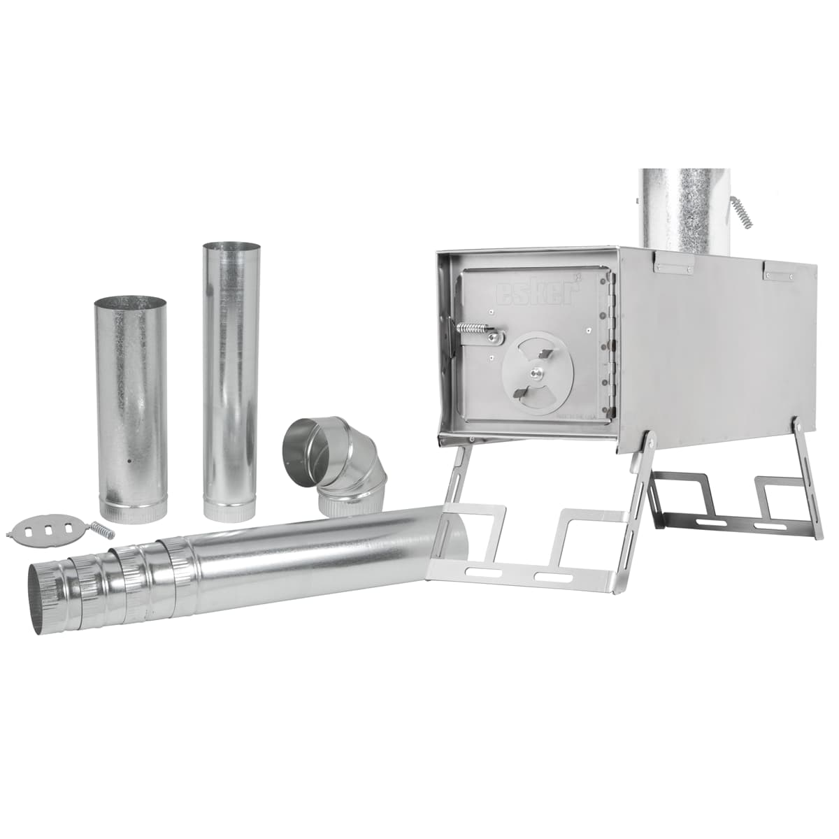 The Esker Ontario winter camping portable wood stove is designed for use with Esker's Arctic Fox 10x10, Classic 10x10, Classic 2 10x10, or similarly sized winter hot tents, and features cold-rolled 22 gauge steel construction, and a nesting galvanized pipe stack.