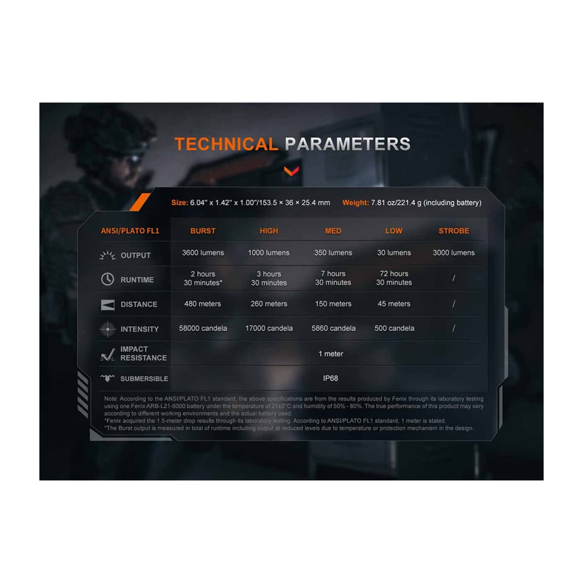 The Fenix TK21R is powered by a high-capacity 6000mAh battery which is USB-C rechargeable via a hidden port (no external battery charger needed). With 5 lighting modes, and four brightness levels, it has a max output of 3600 lumens with a 480m beam distance.