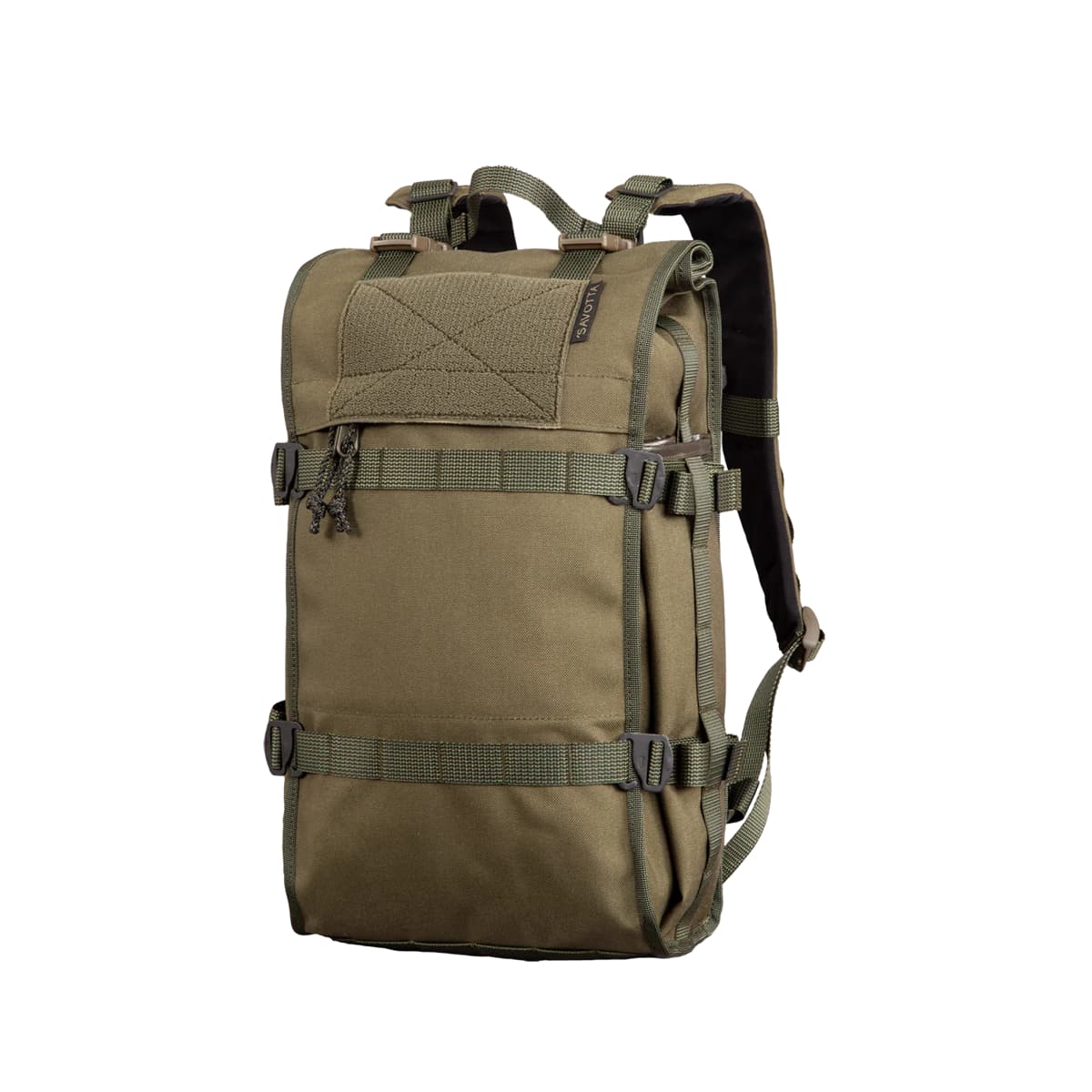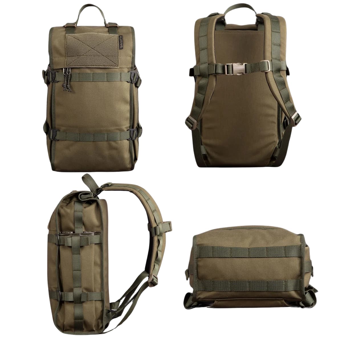 The Savotta Kahakka 15L daypack is s a compact, no-nonsense, functional and rugged pack that's great for every day use. The Kahakka features a main compartment with a fold top that is quick and easy to open and close using two SR buckles (and protects from rain, mud, snow). The interior sports a hydration bladder / radio compartment, with two tie-down loops and a hydration bladder attachment webbing tab on the top, as well as one antenna/cable/tube port on each side of the pack.