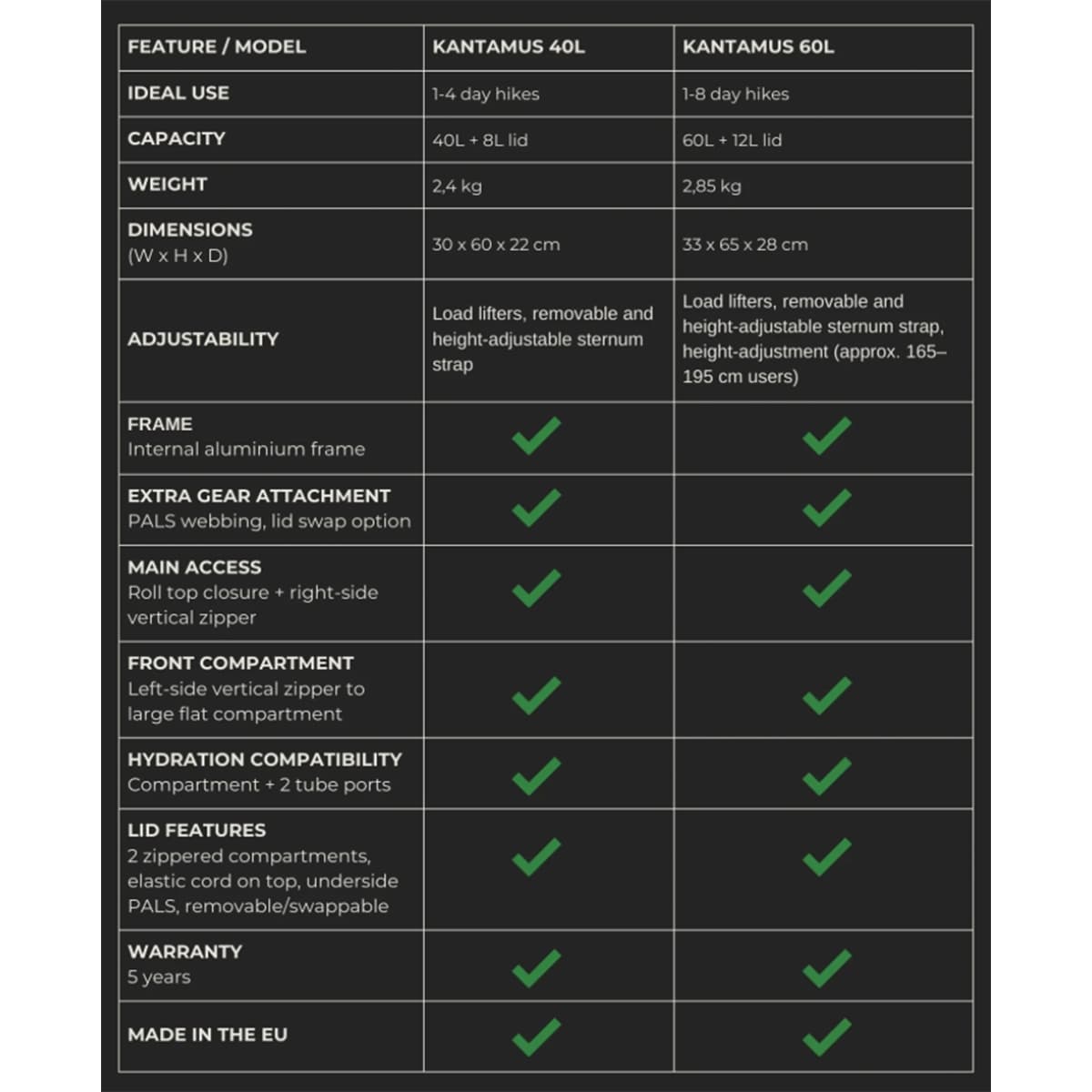 The Savotta Kantamus 40L multi-day pack provides smart, efficient design, with lots of places to stow gear, and easy access to all parts of the bag once packed. The Kantamus houses an internal aluminum frame with a closed cell foam back pad, which makes it excellent for carrying heavy loads over long distances. Padded shoulder and waist straps add to the comfort level when fully loaded. An adjustable floating lid section provides internal pockets and lash points top and bottom for rain gear or extra layers and jackets, and the main compartment sports a roll top lid for maximum space efficiency and expandability. Two side pouches provide space for water bottles, canteens or other supplies, there's a hydration bladder compartment and tube ports, and the Kantamus sports LOTS of PALS webbing on the back, bottom and sides for modular attachment of other pockets and pouches as needed.